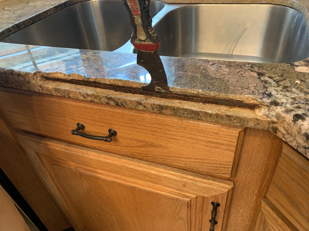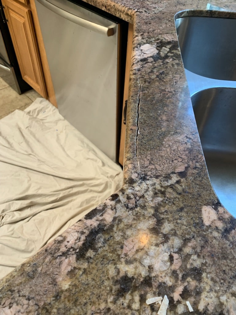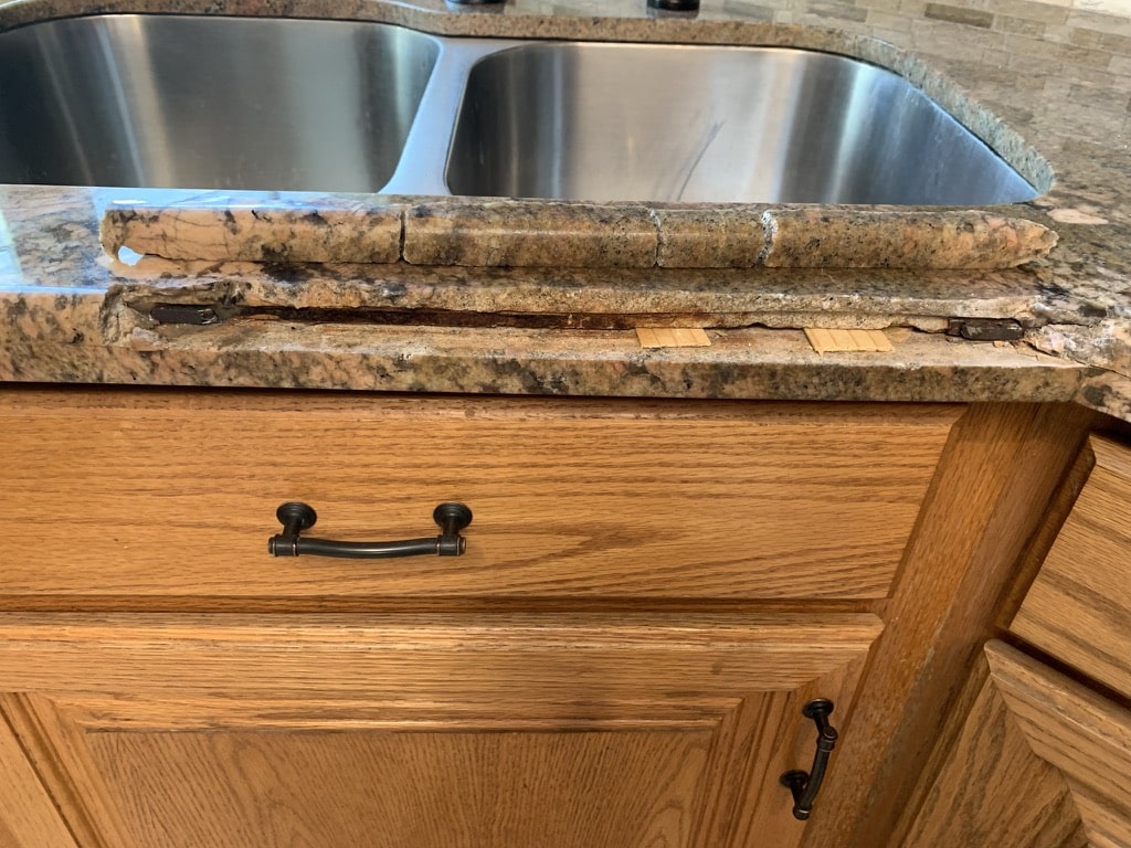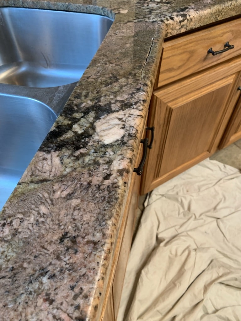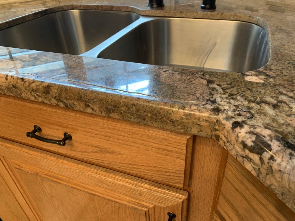 Over the years, caulking around the undermount sink deteriorated, allowing water to seep between the granite and the sink. The hidden metal rod began to rust and expand, pushing upward on the stone. This process, known as rod jacking, is one of the most common causes of cracks in granite countertops.