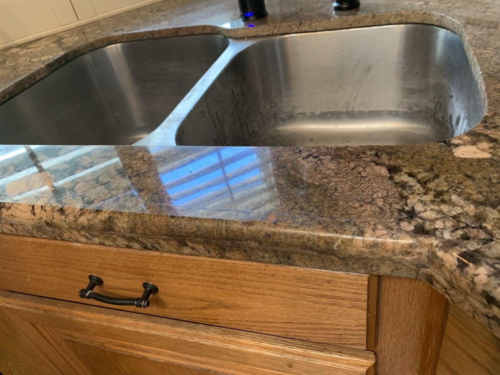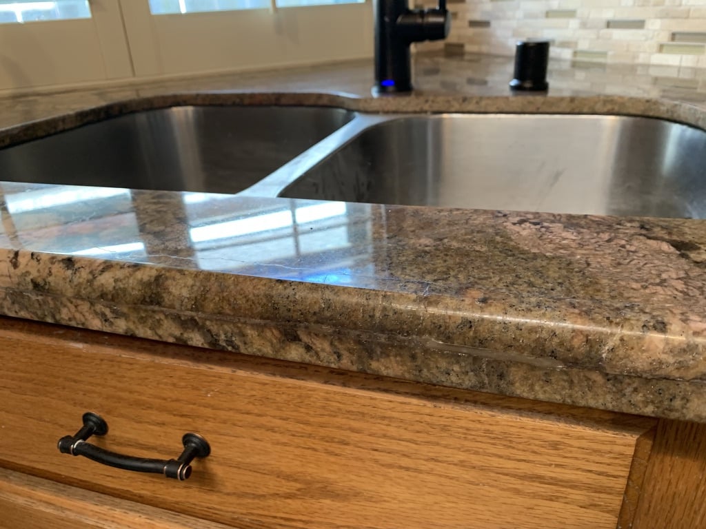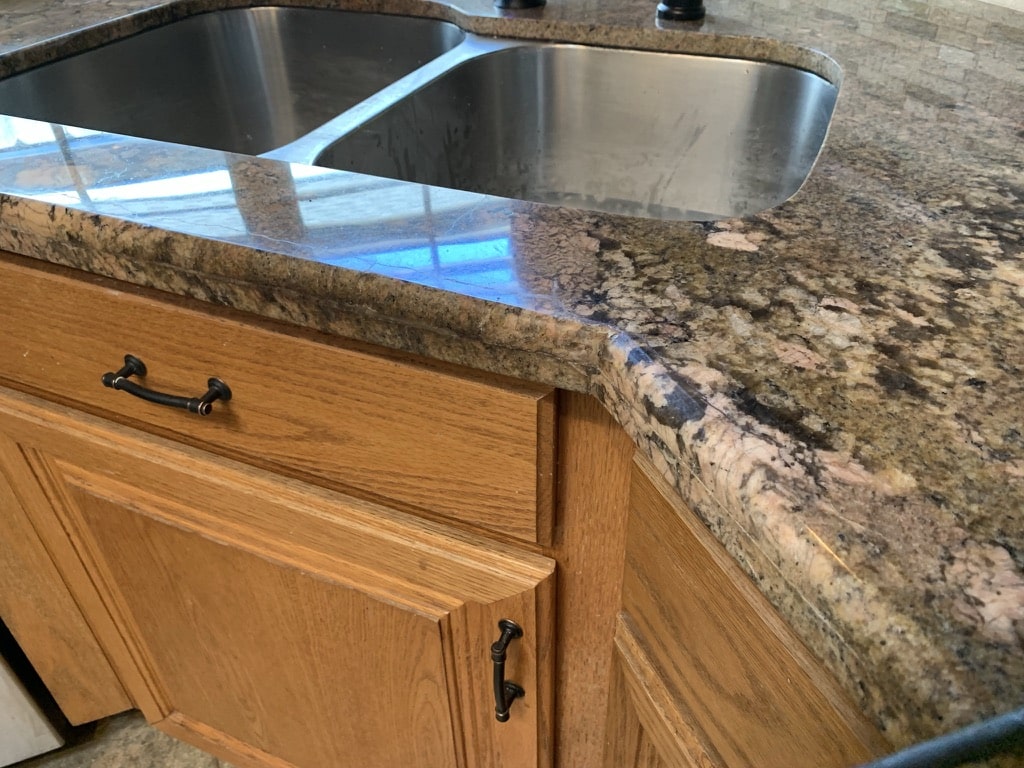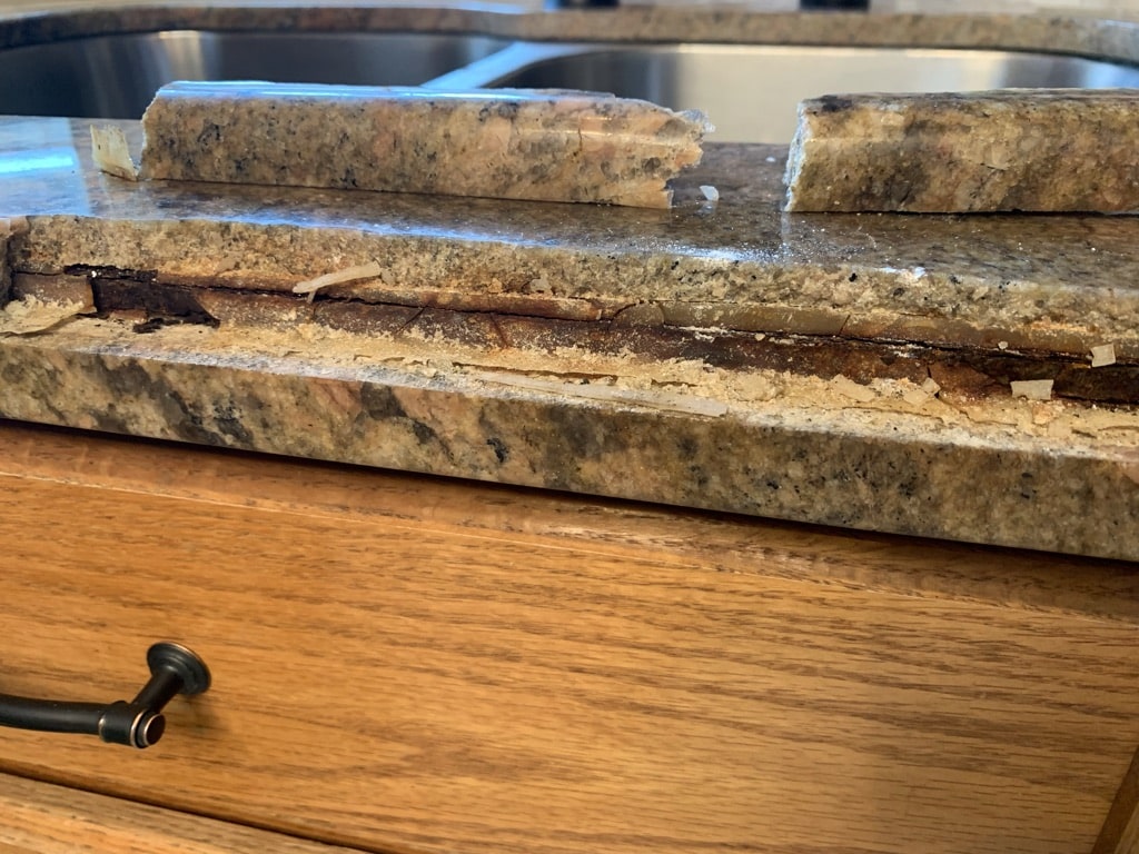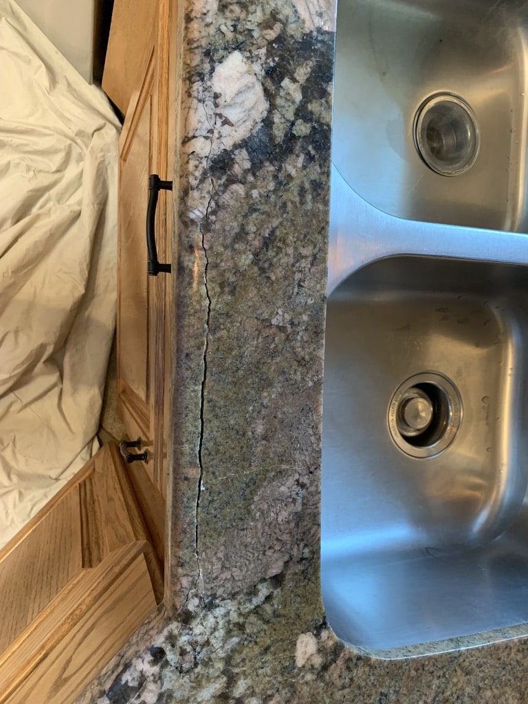 Over the years, caulking around the undermount sink deteriorated, allowing water to seep between the granite and the sink. The hidden metal rod began to rust and expand, pushing upward on the stone. This process, known as rod jacking, is one of the most common causes of cracks in granite countertops.