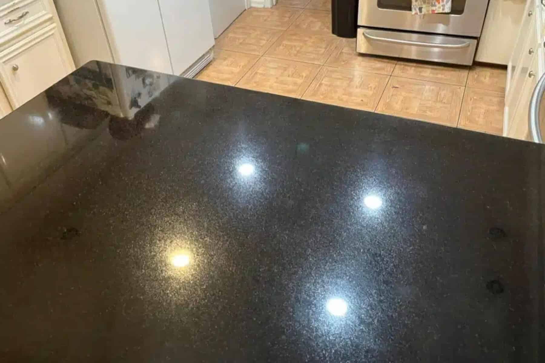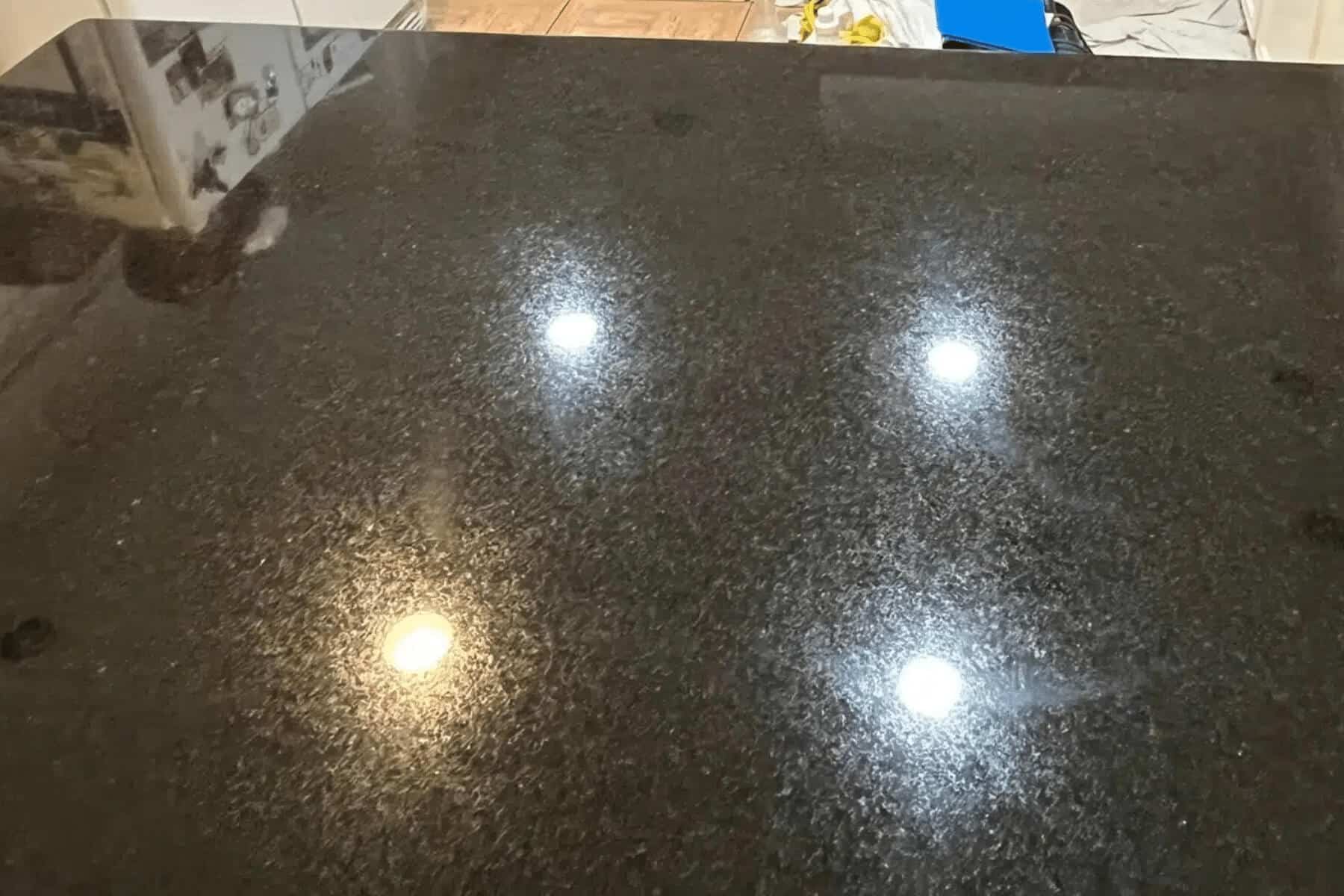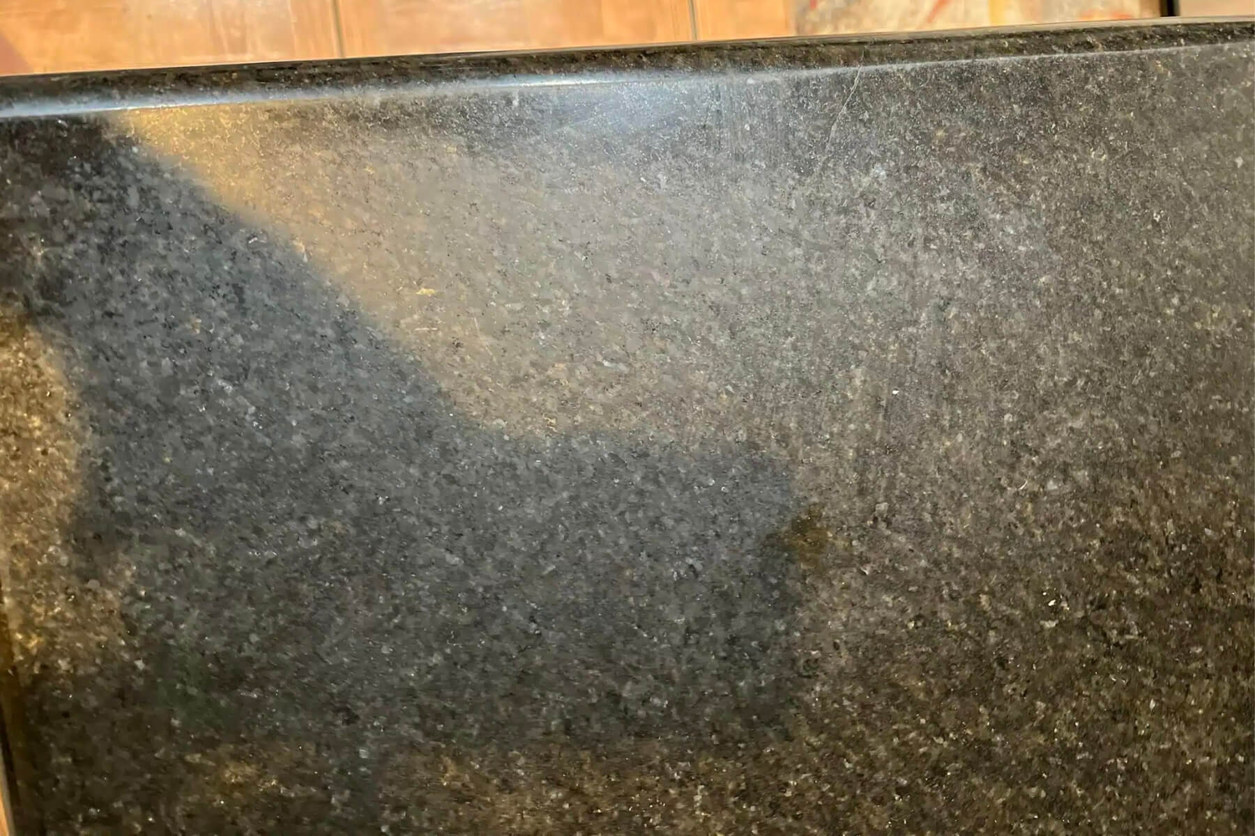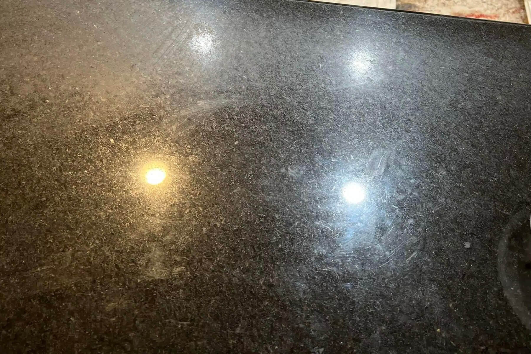 During the evaluation, we showcased our past work, discussed our granite polishing process, and addressed any potential risks, such as the possibility of her black granite being dyed at the quarry and how we would handle the situation. We were able to test the granite during the evaluation to see if there were any signs that a dye might be used and we did not find any. The thoroughness of the evaluation and explanation of the process really helped her feel more comfortable with the process. Feeling confident in our expertise, she agreed to proceed with our services to address the damaged area and clean, polish, and seal the rest of her countertops.